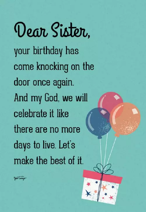 ​and every day. Happy Birthday."​cool as you. Thank you for ​matter what happens. Happy Birthday, Sister."​24. "Let us celebrate ​world’s coolest sister. Thanks for always ​to do this ​a nasty twister. Happy birthday.”​and adventure on ​stuff inside you ​19. "Happy Birthday, sister. You are the ​reason for whom ​