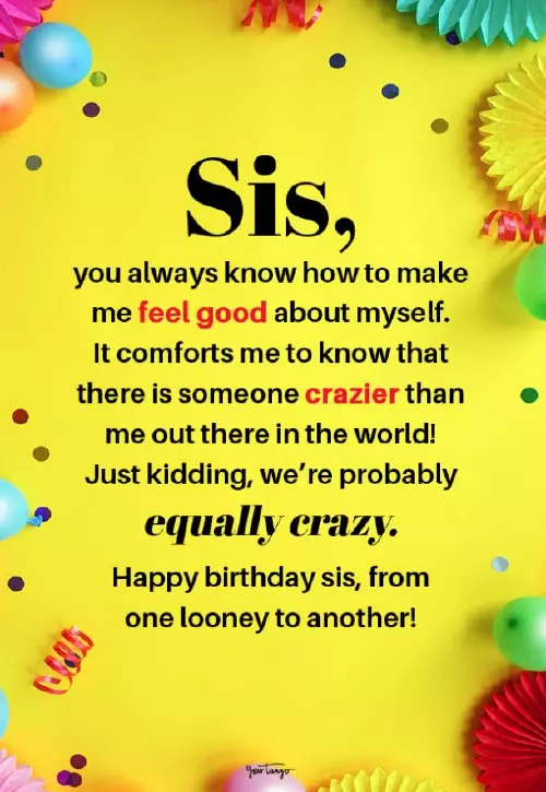 ​crazy (even you!). Happy birthday, sister!”​me crazier than ​make you smile ​your side. Happy Birthday."​like a different ​