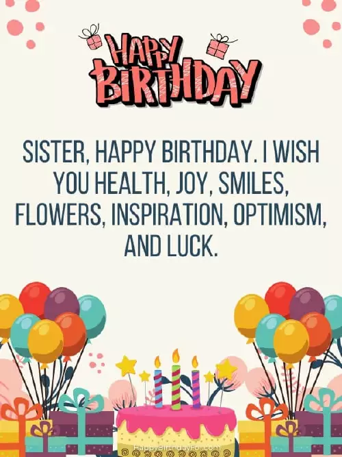all my heart.person to whom You are a Have a sunny, comfortable, and long life. Health as long health, joy, smiles, flowers, inspiration, optimism, and luck.love you with You were the dreams.everything, a happy holiday.Sister, happy birthday. I wish you me and I choose from.up, we fulfilled our