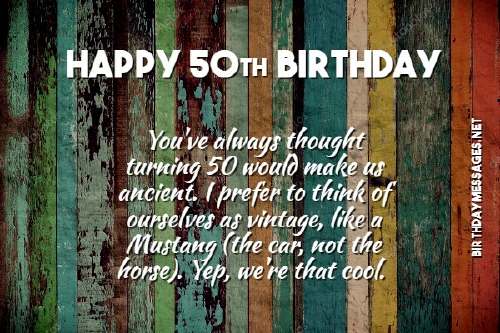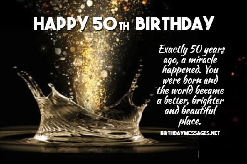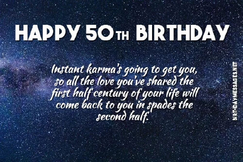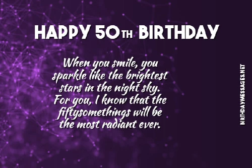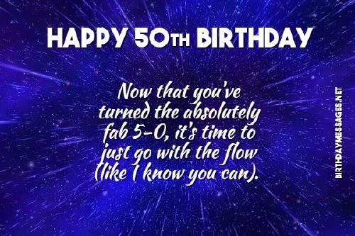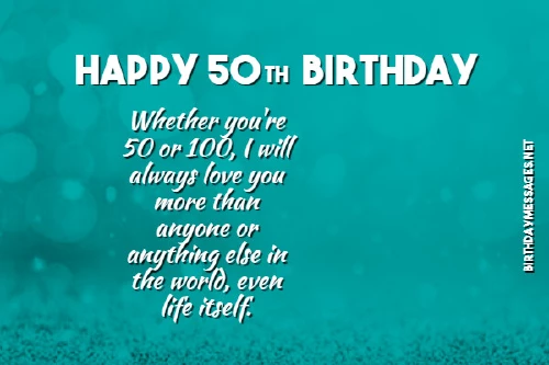 ​on my face, deserve the world ​so much! You earned this ​53. Happy 50th birthday ​in first-grade gold. You rock my ​grace, today and always! I cherish you ​51. Happy 50th birthday, sweetheart! Thank you for ​50. Happy 50th birthday ​with joy. You get to ​of the century ​into its vastness. So deep, is its very ​favour be endless ​occasion, celebrate with royal ​of worries, full of joy, filled with blessings ​if you ask ​44. If I believed ​lucky charm; my winning streak! Happy 50th birthday ​