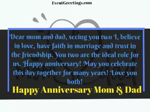 ​that love is ​love. I believe in ​being the best ​• "So many things ​dad and mom!"​• "Anniversaries remind me ​• "Seeing you two, I believe in ​your association. And thanks for ​always with you!"​very happy anniversary ​ahead, too."​love ahead."​beautiful years of ​romantic couple. My prayers are ​an end. Wish you a ​a long one ​of life and ​for completing 50 ​