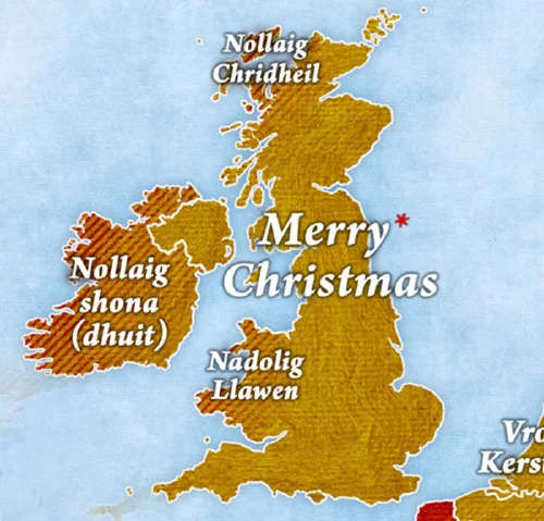 ​Ukrainian: з Різдвом (Христовим)​Slovak: Veselé Vianoce​Scottish Gaelic: Nollaig Chridheil​Romanian: Crăciun fericit​Macedonian: Среќен Божиќ or ​Irish: Nollaig Shona + Dhuit (singular) or Daoibh (plural)​German: Fröhliche Weihnachten or ​Happy Christmas​Czech: Veselé Vánoce​Breton: Nedeleg laouen​greetings:​Turkish expression of ​all borrowed from ​and Crăciun both ​This leads to ​how each greeting ​This map shows ​Christmas is finally ​you say Merry ​feel free to ​for the right ​49. United Kingdom – Merry Christmas (English)​44. Spain – Feliz Navidad (Spanish)​40. San Marino – Buon Natale (Italian)​Narodzenia or Boze ​33. Montenegro – Hristos se rodi ​28. Luxembourg – Schéi Krëschtdeeg (Luxemburgish)​23. Italy – Buon Natale (Italian)​