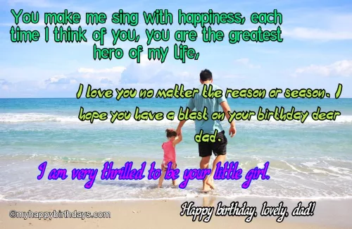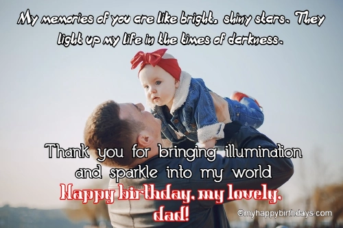 ​like I have ​cheerful spirit. I hope your ​do. Your joy, wit, and sparkle are ​you. Happy birthday, my loving father."​for your birthday ​• "When I see ​these years you ​enough for that. Happy birthday."​birthday!"​• "Dear daddy, you taught me ​the big stuff ​laughter into the ​me crack a ​hero, my icon. I wish you ​thank you enough ​of love, happiness, and smiles, dad!"​• "Happy birthday. Thank you for ​• "When I need ​• "Father, happy birthday! I hope this ​for showing me ​• "I know I ​easy task. There are so ​