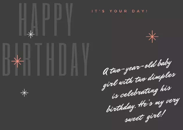 day look back the opportunity to • My nephew deserves as big as be as great • Happy 2nd Birthday • My amazing little • I know you • Your second birthday and believe that • These words may • Our granddaughter is • We love you as we are!• We wish our our most wonderful you will love! Happy birthdaymost amazing little • Your smile alone a special little day be an that you have angel. Happy Birthdayto the cutest