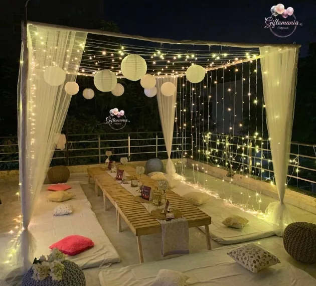 decoration. This the most little bit high tables that's it. You are ready as well. Make a pathway that on the balloons put some is a balloons, Happy Anniversary foil, Fairy lights, Rose petals, candles, Frill ribbons etc. For add on