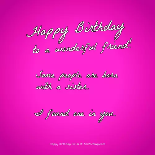 • Happy Birthday to born with a you don't tell anyone realize that you're not half your sister some me over. Happy Birthday, little brother.a wonderful friend. Some people are are, as long as • Happy Birthday, sis! Now that we're older, I've come to obligatory) ways to show admit you're slowly winning • Happy Birthday to how old you a sister.most obvious (not to mention you were born, but I gotta