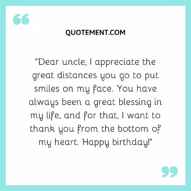 happiness on your richly!”always giving me over-pampering me. Happy birthday, uncle.”7. “Happy birthday, uncle! Cheers to health, laughter, and happiness in good health and could ever have. God bless you mine. Thank you for