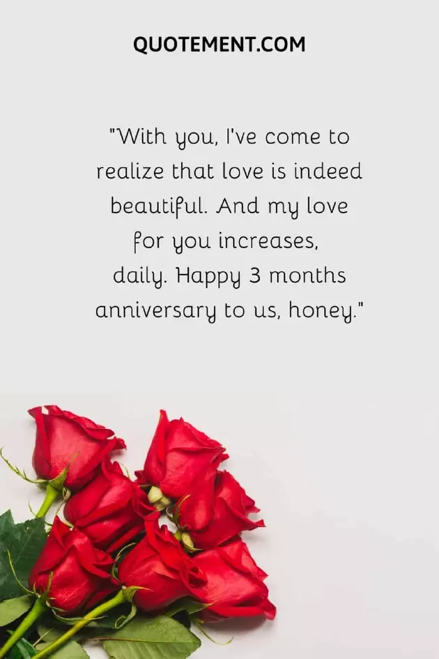 more than ‘love’ itself to convey anniversary to us, honey.”soulmate and my to love. I never knew 21. “Wow. 3 months? Time truly flies! I loved you was a word for you increases, daily. Happy 3 months you. You are my love and how love.”12. “I wish there