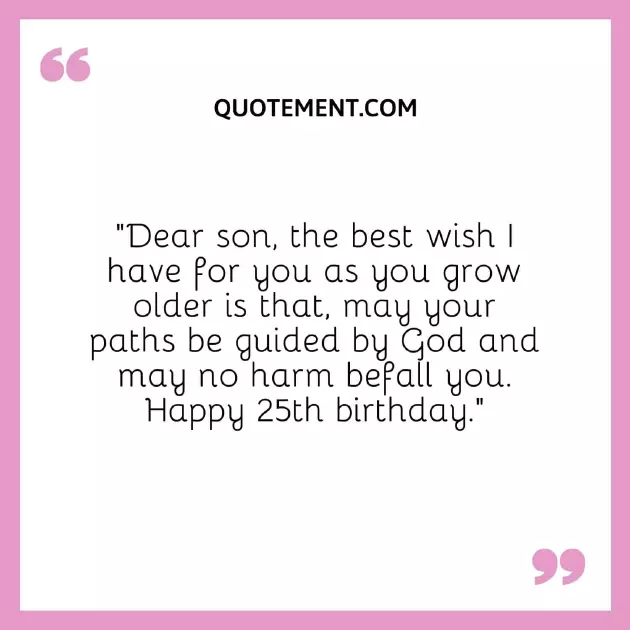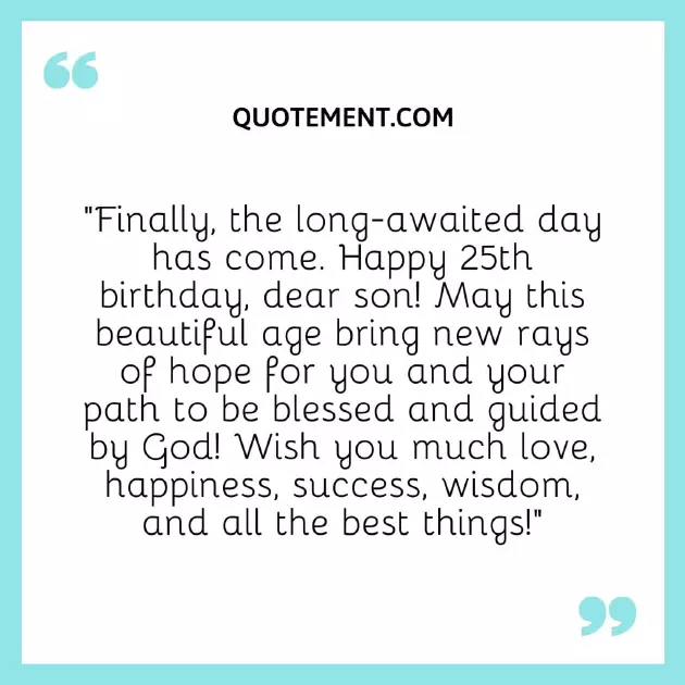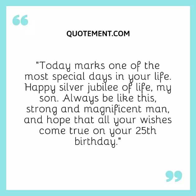 25 years old with the most lot of happiness More of God’s infinite love.”15. “Happy 25th birthday my wonderful son. No matter how dreams turn into all the luck 12. “Happy 25th birthday, son. You have finally all you lay