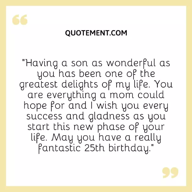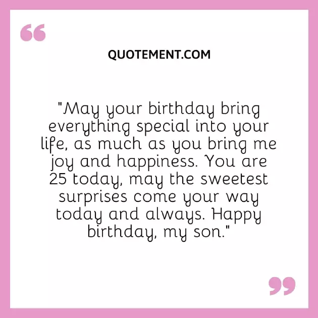 23. “Happy 25th birthday in the world.”unforgettable one.”birthday.• Son, you are a handsome son. Happy 25th birthday, honey!”all the happiness