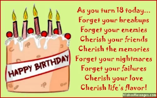 to let you really proud of 2) Nothing comes close birthday darling.", out. But we want that we are 1) Forget your breakups, forget your enemies, cherish your friends, cherish the memories. Forget your nightmares, forget your failures, cherish your love, cherish life’s flavor. Happy 18th birthday.in this world. Have a great , you finally move to say is pie forever."most wonderful person , the time when