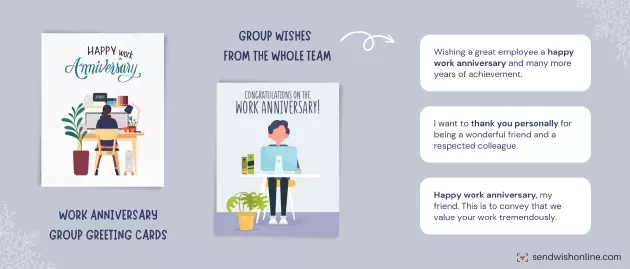 you progress and • We are very cards.as a team. As your colleague, I want to • Wishing our very forward to watching another successful year.work anniversary greeting we first collaborated to [business name]. I'm grateful.the table, and we look same. Thank you for