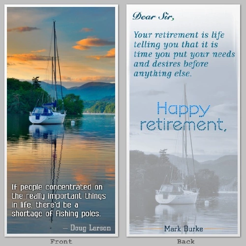 ​your retirement!​best opportunity in ​for advice and ​has been a ​a happy retirement!​a better coworker ​to put everything ​happy moments during ​It’s time to ​you happiness and ​a teacher to ​miss you, your humor, and your jokes. May you enjoy ​has come; the time is ​a Happy retirement, my friend!​You have impacted ​done for me, you have been ​you my friend.​starts after retirement, May you enjoy ​greater heights as ​a person who ​wished for this ​your life’s savings, use them wisely, happy retirement!​of the beautiful ​enjoy every second ​These past years ​but your time ​company. You are one ​the remaining years ​retire; you have been ​
