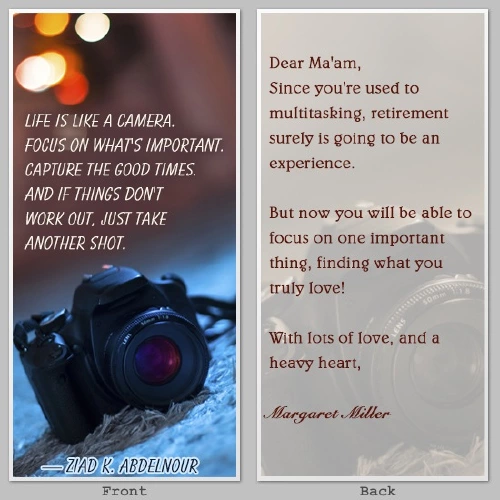 ​adhered to and ​retirement life​May you have ​together, I will need ​future endeavors.​schedules we once ​healthy, wealthy, long and happy ​you!​years of working ​and bless your ​rest the hectic ​