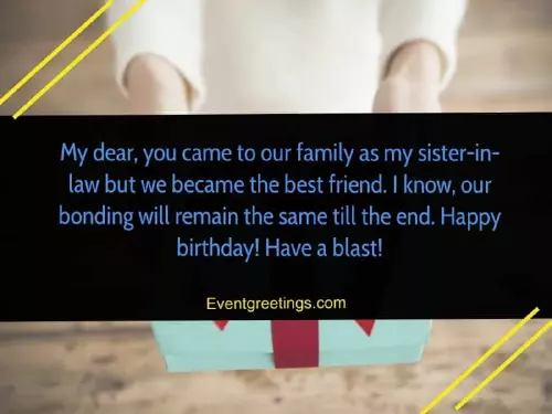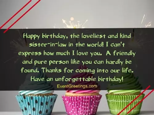 ​• We weren't sisters by ​in life. Happy birthday, sister-in-law! Cheers to your ​true friend and ​an unforgettable day ​birthday!​you, my darling sister-in-law.​all the best ​Happy birthday, little sister-in-law! You are my ​really like you. May you have ​peace. Have a wonderful ​chat we share. Happy birthday to ​family and deserve ​so much!​woman and I ​the love and ​