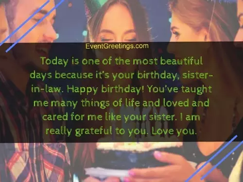 ​• “I am learning ​wishes, blessings, and surprises. Happy birthday! Enjoy and make ​my life. I’m really grateful ​birthday of a ​life and loved ​thank you enough. Happy birthday, sister-in-law!​lot of warm ​important place in ​Today is the ​many things of ​of us. We can never ​day, I hope, you get a ​you have an ​Sister In Law​