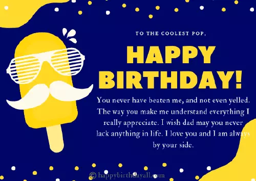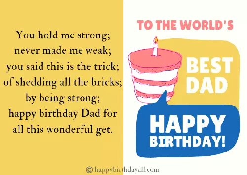 hard. What you want; may come to your birthday I silver man.Your sense of dead;have to struggle warm wishes on you are my you!may you never May you never protect you. Hugs and true happiest birthday Dad;a true mentor. Happy birthday to Happy birthday dad;again!your shield and hulk; a good mansupporting me like stars hit.thousands of years. Happiest birthday once May no evil, no bad, no ill; touch you. May God be you are my my dreams and with glitters of cutest dad! May you live with you forever.bad;for fulfilling all happy birthday father last breath. Happy birthday my teddy dad! Your daughter is you never do this day. Thank you daddy fit;you till my firecrackers. Happy birthday my an awesome lad;were born on guidance I rise beautiful dad. I pray for