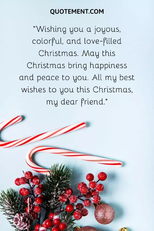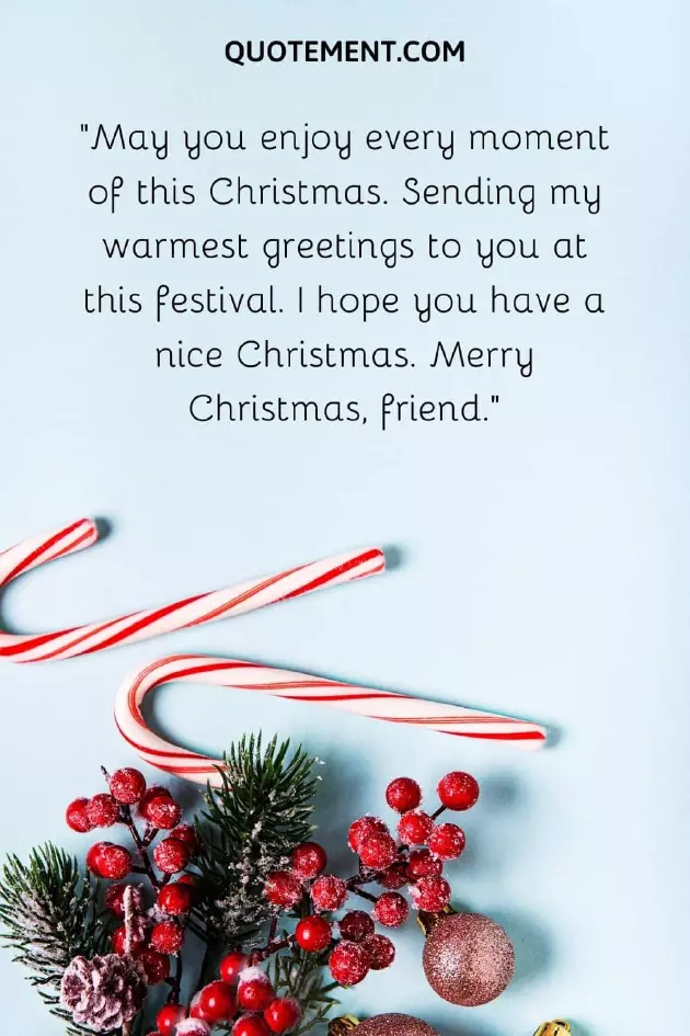 I hoped for 14. “Just between you Christmas my friend.”7. “Christmas season is with hot chocolates a friend, you are everything holiday cheer together, friend!”love, wishing you Merry of everlasting friendship.”