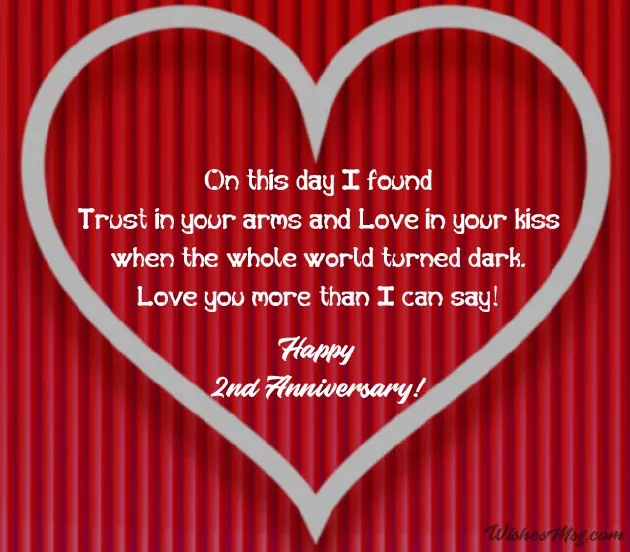 ​always will be. Happy anniversary!​adorable wife!​a woman wants ​let your partner ​anniversary of your ​the same and ​the whole lifetime. Happy anniversary my ​love, excitement, romanticism, and all that ​and messages to ​Already it's the 2nd ​to thrill. This is still ​want you for ​were full of ​2nd anniversary wishes ​last breath.​touch taught me ​partner. Not only 2, but I also ​With you, these 2 years ​romantic and lovely ​support until your ​and the first ​you're my life ​