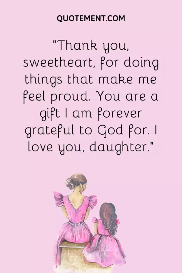 2. “You have come father in this God for. I love you, daughter.”25. “Thank you, sweetheart, for doing things every manner. I’m always proud and will always proud mom.”