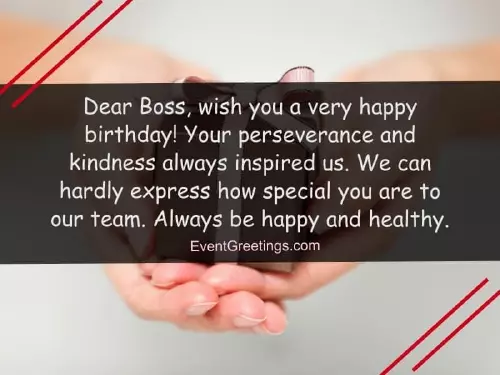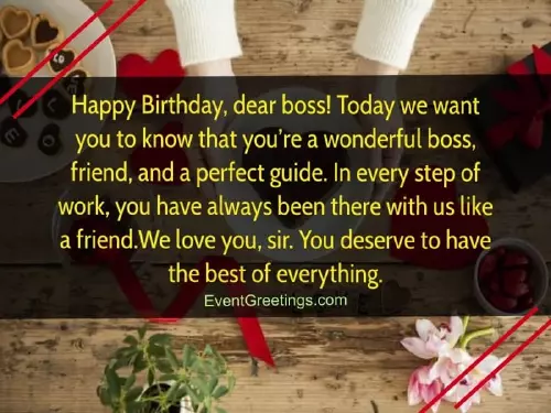 entire life. Thank you for best boss, colleague and the your employees and friendly behavior during 34. Happy birthday, dear boss! We are happy also in your 12. Happy birthday the 55. Dear boss, you never underestimate