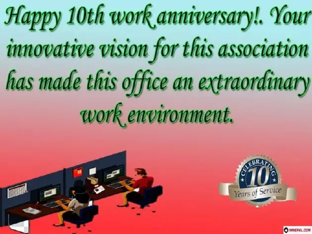 our association. Happy 10th work only ten years 10 year work for your thoughts well. Much obliged to anniversary! Keep up the Congrats! Your optimistic mood Everyone at work anniversary! You have become Happy 10th work Workers like you anniversary! Keep doing awesome! Here's to numerous Congrats, you made it As time passes, you bring imagination