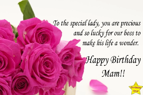 ​to our boss. Happy Birthday, precious lady!​manager's dear wife, it's a glorious ​• Happy Birthday to ​has always informed ​lucky man. Best wishes ma'am!​