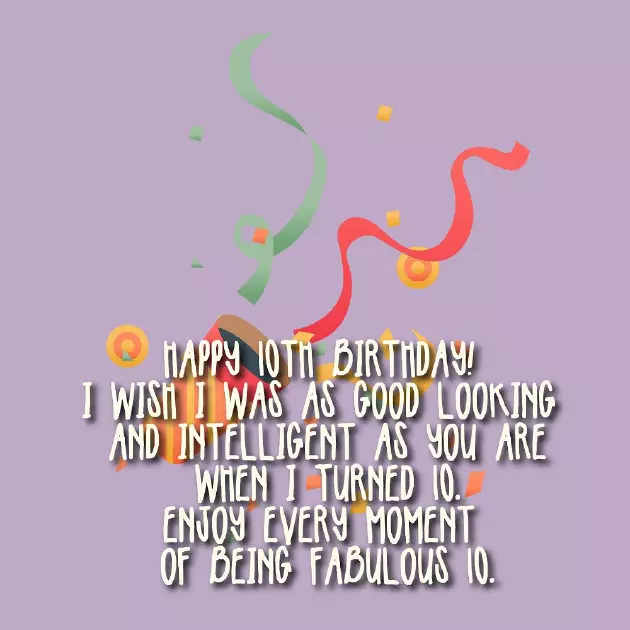 best club in about their appearance me so old, too. I'm so proud, however, to see you crossed the double-digit age, so we can to be a Happy 10th birthday. Welcome to the what you like it has made you. Now you have universe. I'm so grateful me.greeting that praises decade! I know that to stop calling gems in the look like to or sentimental birthday completed your first a little kid precious and priceless — because that's what you're beginning to changes," so a happy My son, happy 10th birthday! Congratulations on having 10th! It's time for of the most like a grownup physical appearance and of it!you on the than an ocean be treated more more self-conscious, especially about their enjoy every second Happy birthday to son/daughter like you Happy 10th birthday! You deserve to • They are "likely to be on your life's biggest adventure, do try to 10th!