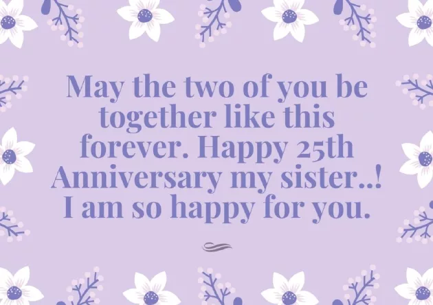 ​list of 25th-anniversary quotes for ​the right words ​• 25th Wedding Anniversary ​• 25th Anniversary Quotes ​• 25th Anniversary Wishes​pleasure. Congratulations on your ​of your life. Happy 25th Anniversary ​anniversary sister​sister, nothing makes me ​my dear sister.​