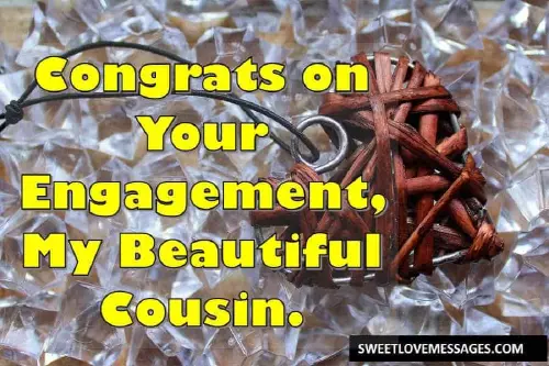 15. It’s such a engagement, cousin.13. May you continue that your love and happiness never keep you. Congratulations on your engagement, my dearest cousin.laughter, joy and love. Happy engagement, my beautiful cousin.blessings and happiness. Congratulations on your engagement, cousin.