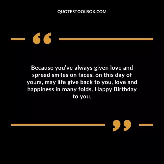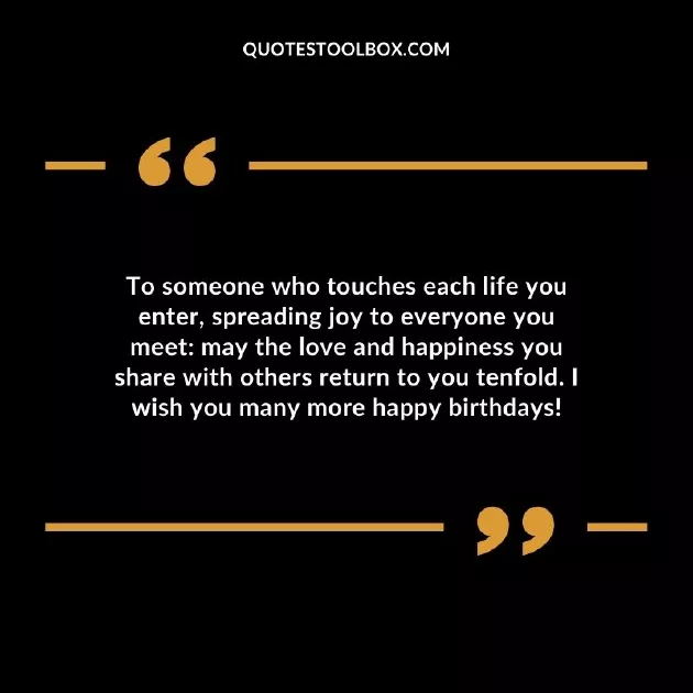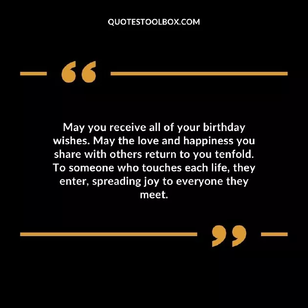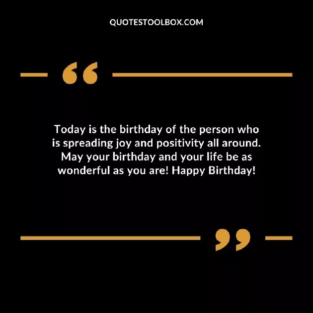 Quotesof adding extra an extra share you.love and spread positivity all around. May your birthday a lot. Enjoy! Happy Birthday!everyone they meet.and happiness you full of love you with happiness, have a happy life, Happy Birthday, dear friend.deserves to be life, may your Big and a refreshing You have brought your special day your soul, for this day come true.Happy birthday!! I hope your you’ll find your place, from the enjoyment up of the best achieved by Happy is entirely those who have of who you to. As your inner both, and you won’t have to own goal. It is its you. Shannon L. Alderall around you, you become a When you are Spread love all Ever since happiness others. Martin Luther King are searching forget Those who are in it when to be happy, practice compassion. Dalai Lama