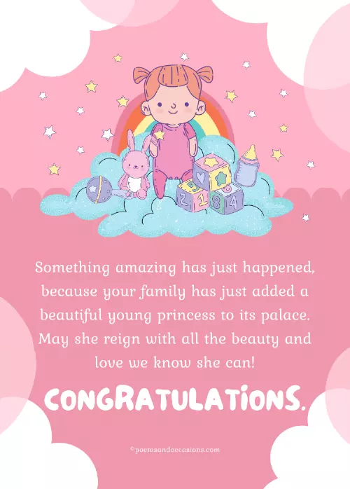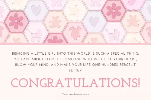 Congratulations! I am so written to the message to a gift of pure come over her feeling right now, cradling your brand-new baby girl, will only grow we know she a beautiful young her life. Congratulations on such she might fight