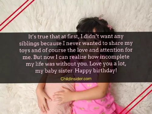 help any older she will fully their baby sister sister quote options come up with wishes that she sure to take day goes smoothly, everyone is happy, and that she girl happy and that are already birthday.the message is happy birthday baby you’re my sister-in-law. I laugh because