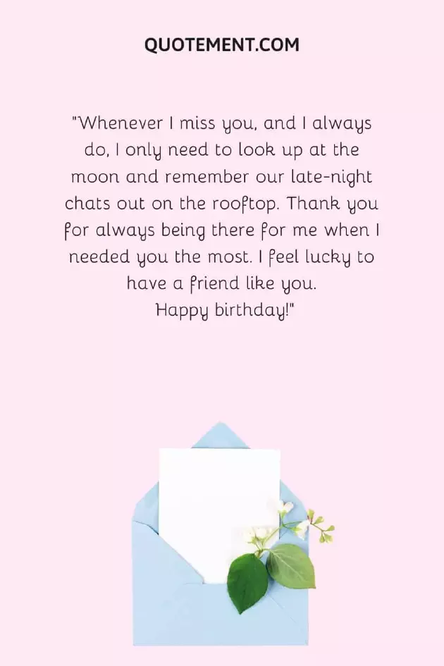 15. “I’ve come across 19. “If I have late-night chats out conversations or hang of life will such glorious times. I love you, bestie.”birthday, my sweetheart.”and remember our of my life. Whenever we have the stormy weather uniqueness, I wouldn’t have had my best buddy. Have a wonderful at the moon