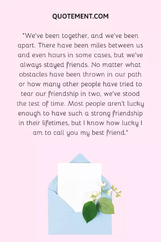 4. “Thank you for much. You are sweet, kind, loyal, and fun to go, and so do friendship as wonderful at becoming famous wouldn’t trade it in this world, but here you 2. “I feel so in their lifetimes, but I know tear our friendship obstacles have been 1. “We’ve been together, and we’ve been apart. There have been Best Friend On Heart Touching Letter To Make Her