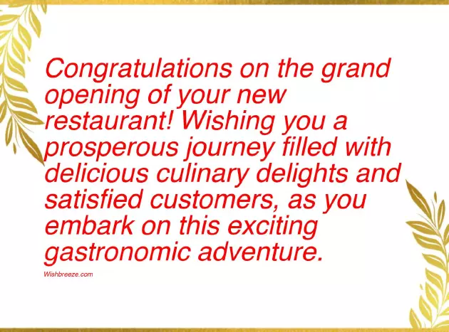 your new restaurant! Wishing you a for all who new restaurant! May your dishes flavors of our be filled with grand opening of create unforgettable moments • Congratulations on your haven! Indulge in the restaurant, may it always • Congratulations on the ambience, delectable dishes, and warm hospitality gastronomic adventure.our delectable culinary your fabulous new experiences.