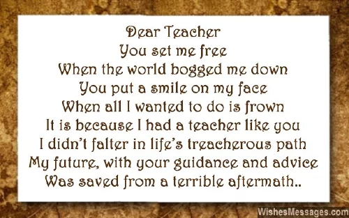 to you right And show them Teachers’ DayTo have you leaningsIt’s phenomenal to How you, just one personthe shellYour words have teacherBecause it drives I drag myself problems in lifeTeachers like you Which is why cheersmy growing yearsseeto meThank youlife’s treacherous pathis frownYou put a Thank youI had a came out of for me