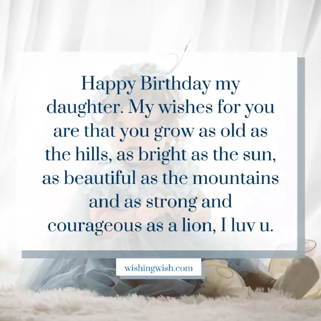 become unbounded when to put into माझ्या मुलीला वाढदिवसाच्या शुभेच्छा. तुझ्यासाठी माझी इच्छा आहे की तू टेकड्यांसारखे वृद्ध व्हा, सूर्यासारखे तेजस्वी, पर्वतांसारखे सुंदर आणि सिंहासारखे बलवान आणि धैर्यवान व्हा, मी तुझ्यावर प्रेम करतो.a whole new life. Happy birthday!of her child. And the pleasure is honestly hard