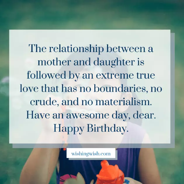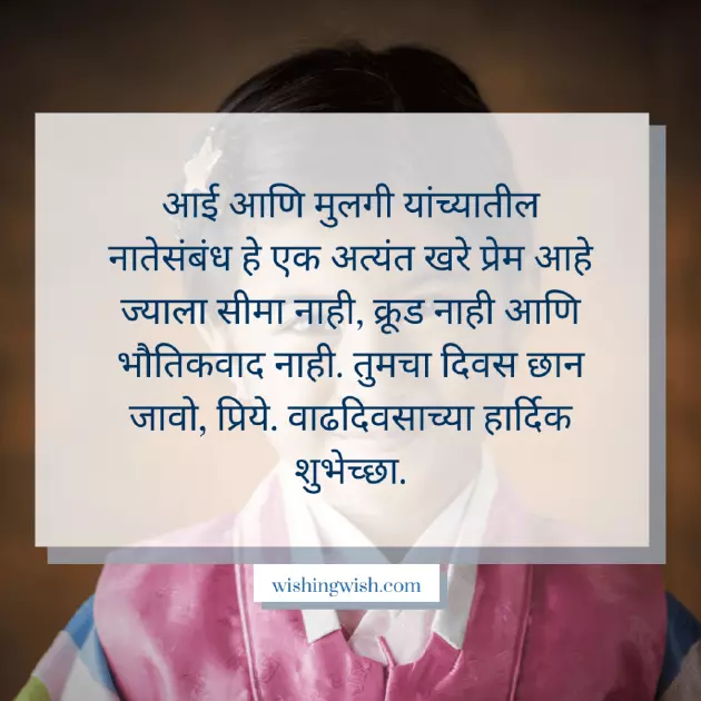 birthday and pray given me the recall the walks आई आणि मुलगी यांच्यातील नातेसंबंध हे एक अत्यंत खरे प्रेम आहे ज्याला सीमा नाही, क्रूड नाही आणि भौतिकवाद नाही. तुमचा दिवस छान जावो, प्रिये. वाढदिवसाच्या हार्दिक शुभेच्छा.happy that you a very happy
