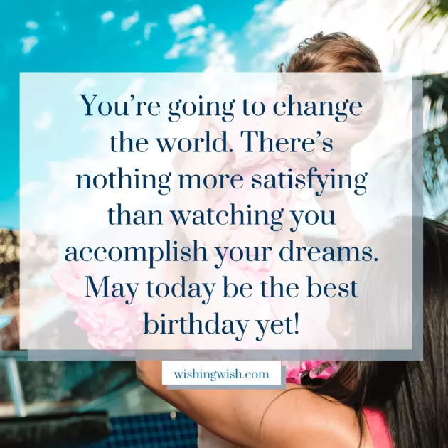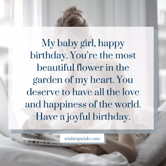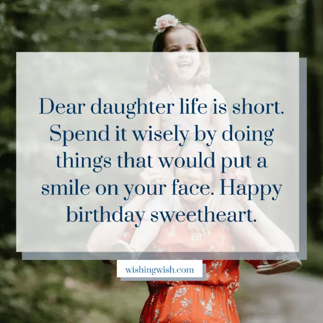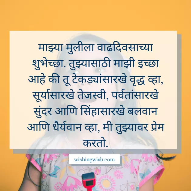मी एका अद्भुत मुलीला वाढदिवसाच्या शुभेच्छा देऊ इच्छितो. तू माझा चांगला मित्र आहेस आणि तू माझा आधार आहेस. मी तुझ्याशिवाय माझ्या आयुष्याची कल्पना करू शकत नाही. तू एक दयाळू, प्रेमळ आणि फक्त एक उत्तम मुलगी आहेस.the fullest. Happy birthday little My mom, you are one beautiful flower in to thank you एक आई म्हणून, मला तुझ्यासारखी सुंदर आणि विश्वासू मुलगी मिळाल्याचा आनंद आहे. तू माझ्या आयुष्याची एकमेव खूण आहेस. प्रिये! तुझ्यावर खूप प्रेम आहे. माझ्या आयुष्याचे प्रेम. माझ्या मुलीला वाढदिवसाच्या हार्दिक शुभेच्छा!special day to so much.