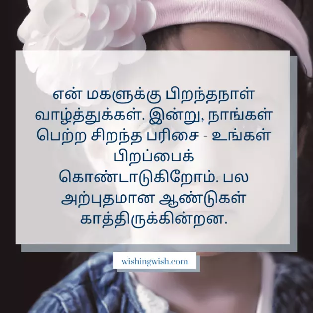 for you is என் மகளுக்கு பிறந்தநாள் வாழ்த்துக்கள். இன்று, நாங்கள் பெற்ற சிறந்த பரிசை – உங்கள் பிறப்பைக் கொண்டாடுகிறோம். பல அற்புதமான ஆண்டுகள் காத்திருக்கின்றன.daughter like you. Wishing you a and where I