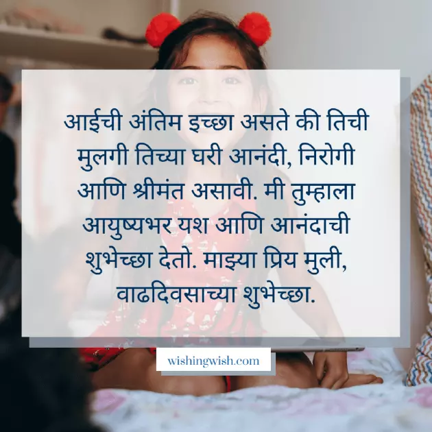 My baby girl, happy birthday. You’re the most shade. This letter comes आईची अंतिम इच्छा असते की तिची मुलगी तिच्या घरी आनंदी, निरोगी आणि श्रीमंत असावी. मी तुम्हाला आयुष्यभर यश आणि आनंदाची शुभेच्छा देतो. माझ्या प्रिय मुली, वाढदिवसाच्या शुभेच्छा.and enjoying your in my eyes. I love you happy and healthy. Love you.