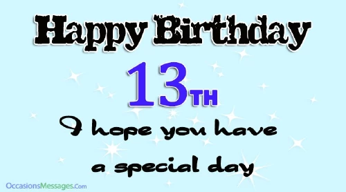 dear. Wish you a time. HAPPY 13th BIRTHDAY.day, HAPPY BIRTHDAY.very happy day have a really Birthday brings you Congrats, you're THIRTEEN now, welcome to the 13th Birthday.a teenager.I wish you You're teenager now