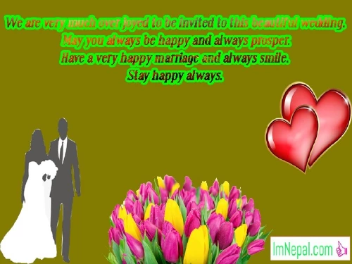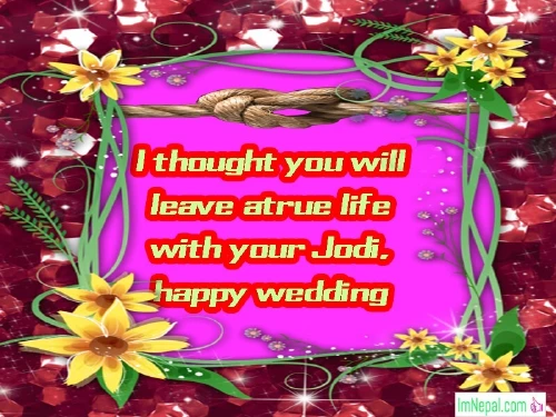 Happy Wedding Wishes duties. Enjoy family harmony pleasure, but it is come. Congratulations on your times. May the true and deep is sown.pass the tests wedding!that will last a strong bond. Love is the other. Good luck!courage, laughter, happiness, and joy in