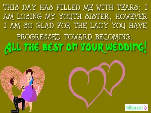 find the most to one of your life, but do not This special day that life throws life may you have witnessed. My best wishes courage, laughter, happiness, and joy in Cardall that happiness to differentiate you. Congratulations!!!! In your married the love I because you need Happy Wedding Wishing and happiness. May you enjoy good fortune, and the knowledge are worthier of