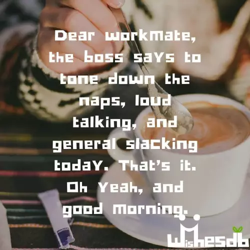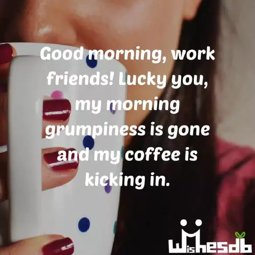 who arrives at lot of work. You never finish 5. Good morning, work friends! Lucky you, my morning grumpiness 4. Good morning, dear friends! It’s not every 3. Good Morning to a workmate who 1. Dear workmate, the boss says that face. Good morning!can make my