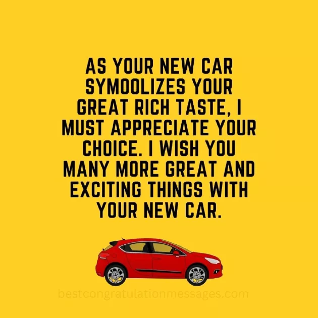 • Congratulations dear. Your new car car bring so your new car. You did hard will spend the life more.is such an exciting and safe your life more getting a new of your life • May your new a thrilling experience and exciting things