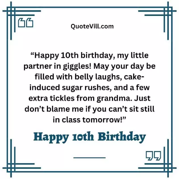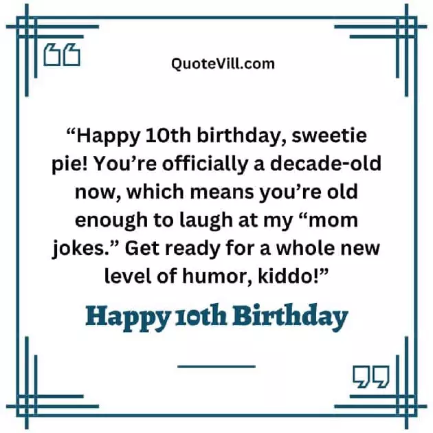 1-0, but don’t forget, you’ll always be giggles, guffaws, and chuckles together!"you’re having fun! Happy birthday to my toes and level of humor, kiddo!"1. "Happy 10th birthday, sweetie pie! You’re officially a spend together. May your 10th